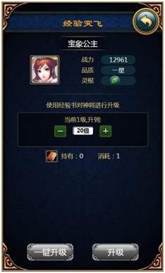 神将招募之后默认为1级,突飞会消耗经验书,想要快速提升等级可以使用经验书突飞,突飞时经验书的数量必须满足至少提升1级才可以使用,经验书可以在商店购买。