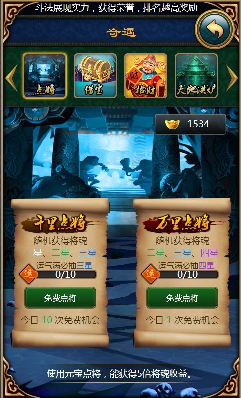 (4) 首次使用元宝”万里点将”必出10个四星将魂,使用元宝万里点将可以获得5倍将魂收益,并且获得运气值,累计10点运气后下次万里点将必出四星将魂
