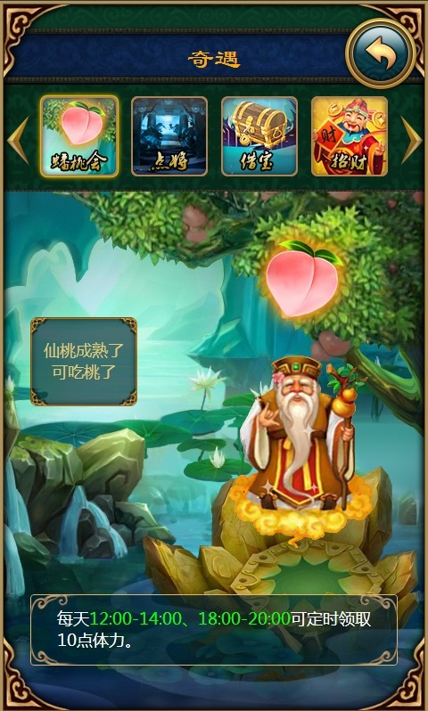 每天早上12-14点和18-20点可以在蟠桃会领取蟠桃一个,吃下蟠桃回复10点的体力。蟠桃不能叠加,每天记得在刷新前领取,错过就没有了。