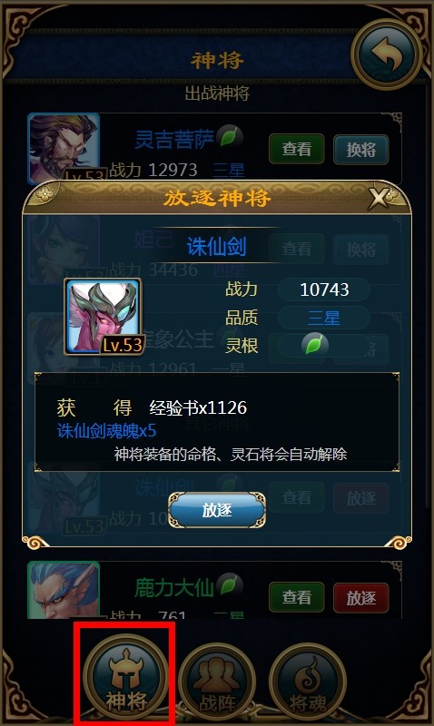 在神将界面,点击详情可以对没有出战的神将进行放逐,放逐之后可以获得当前经验的80%经验书和50%当前神将的魂魄返还,已上阵的神将无法放逐,必须是未上阵状态。